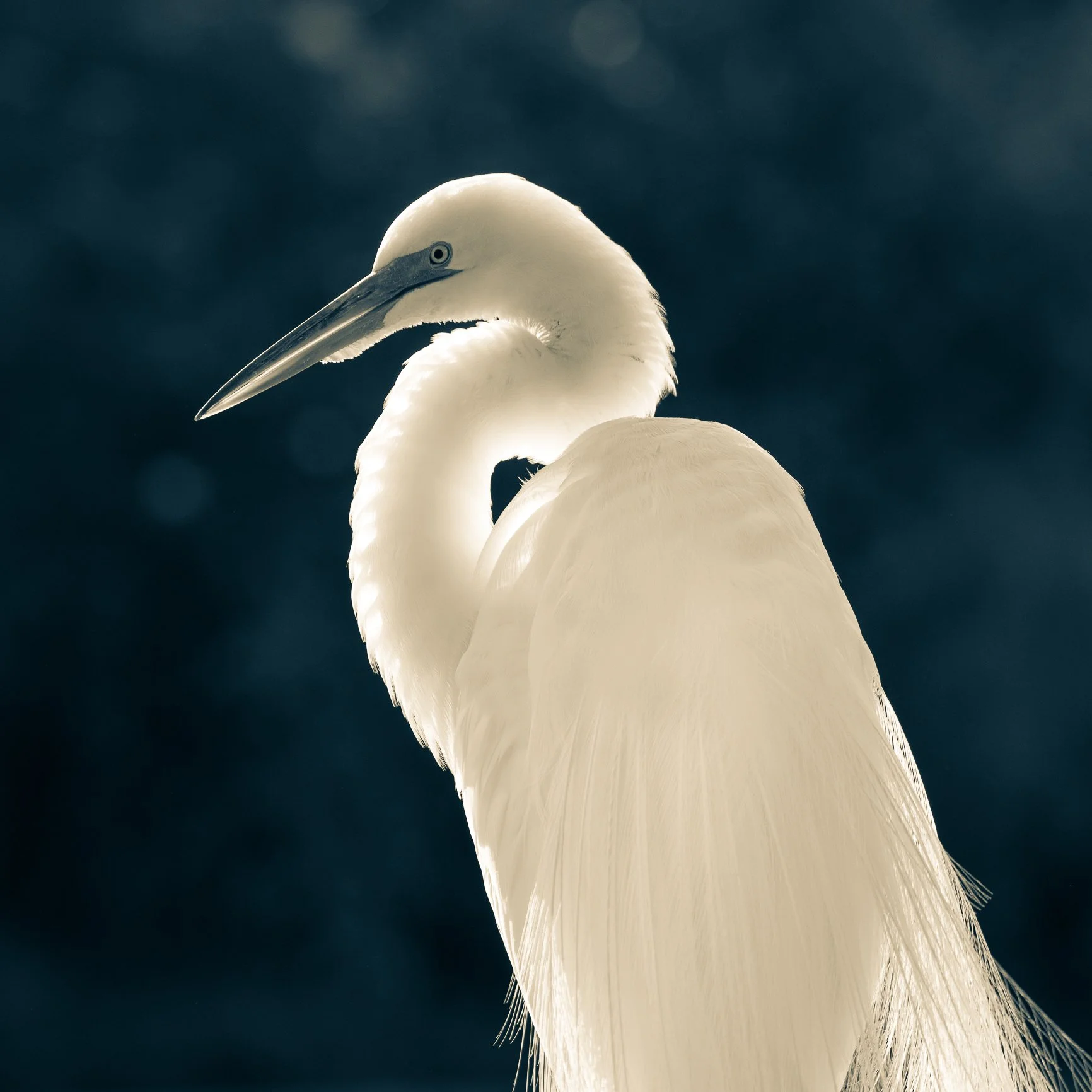Great Egret, backlit (split tone). Orlando, Florida