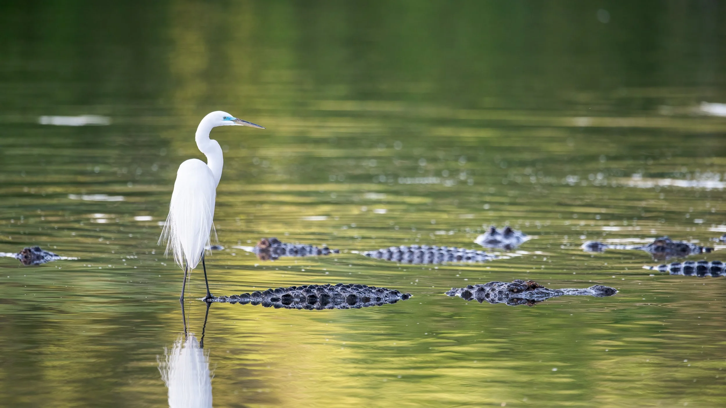 "Testing Fate." Great Egret on the back of an alligator. Orlando, Florida