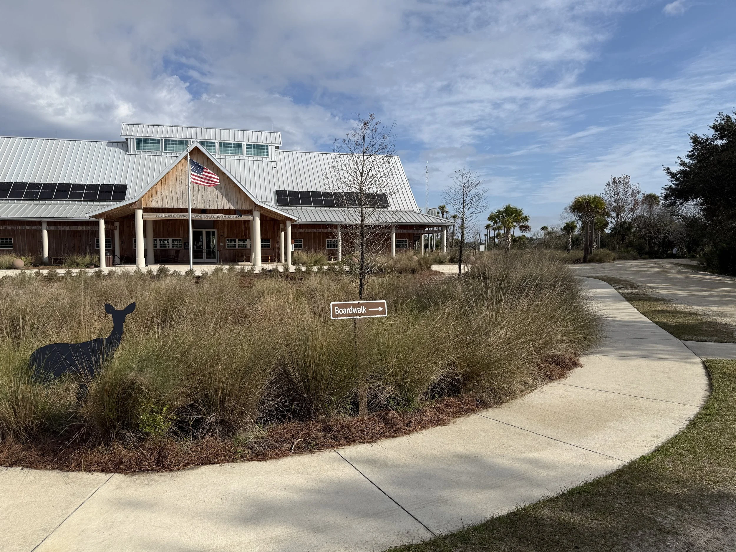 The trail splits into a Y in front of the nature center. Take a right to head down to the boardwalk.