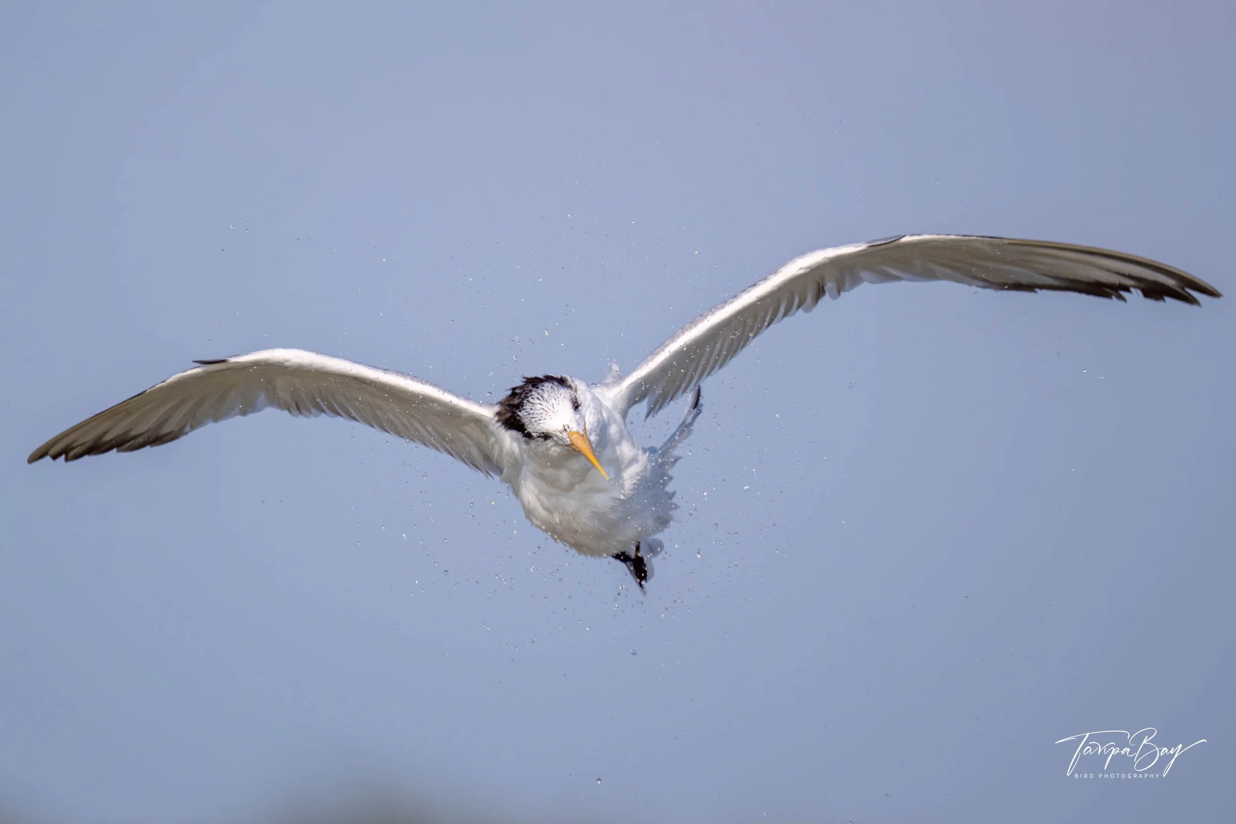 Royal Tern. Sometimes the birds appear to flying upside down while shaking the water off. Nikon Z9 with tripod mounted Nikkor Z 800mm f/6.3 VR S lens at ISO 400, f/7.1, 1/3200 sec.