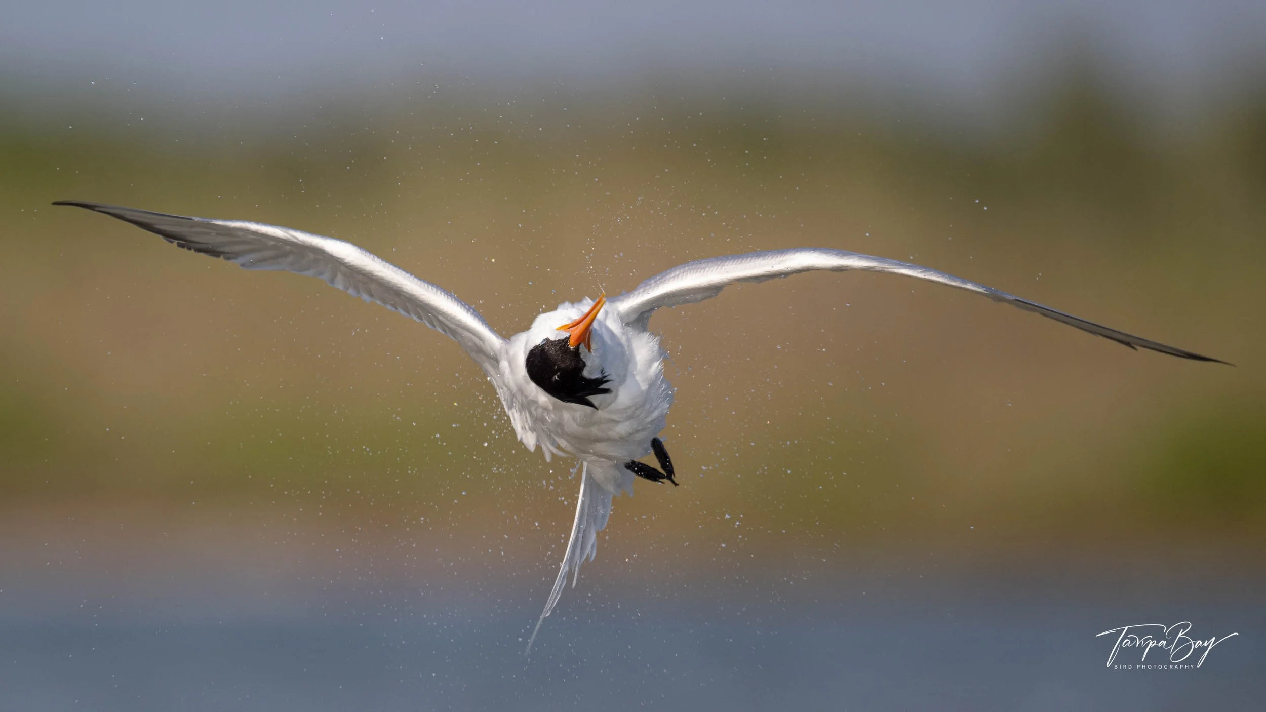 Royal Tern. Twisting in the air, the bird shakes off the water creating a fine mist. Nikon Z9 with tripod mounted Nikkor Z 800mm f/6.3 VR S lens at ISO 500, f/7.1, 1/3200 sec.