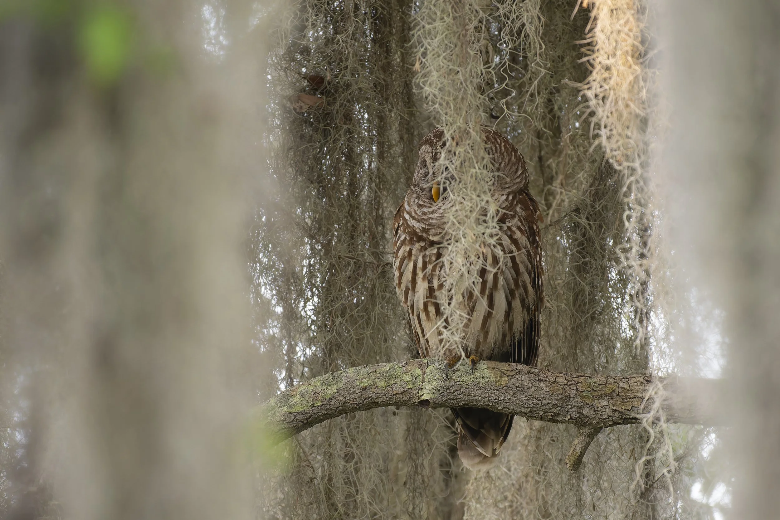 The first notable bird that we saw was a Barred Owl. The bird was about 50 feet from the trail, perched high in a tree draped in Spanish Moss. From our position it was impossible to get a clean shot with Spanish Moss hanging in front of the owl. Still, folks love seeing an owl so we took a few moments to appreciate it and speak about their behavior.