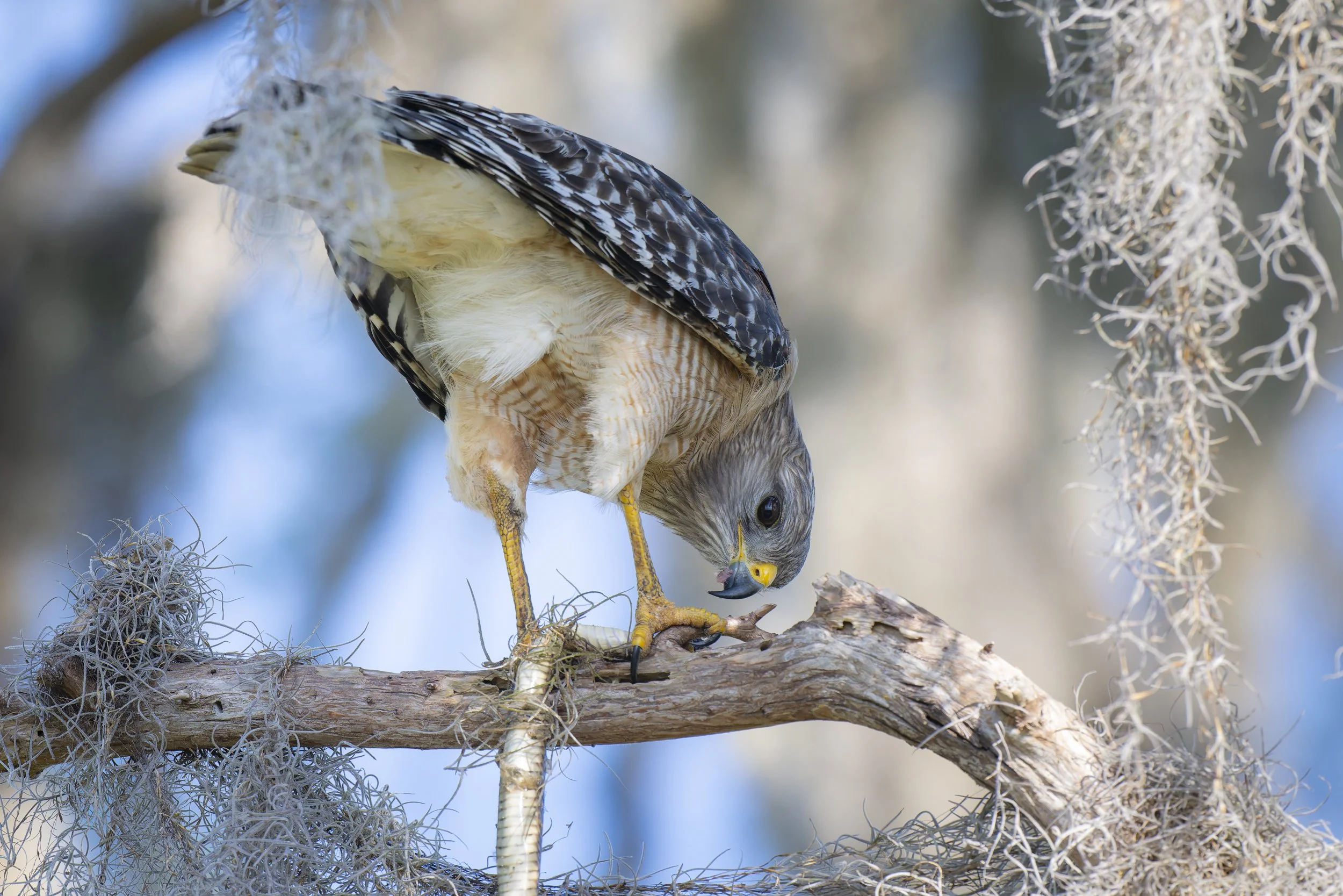 Next we came across a Red-shouldered Hawk perched in a tree eating a snake. He was only a few feet from the trail, so I stopped down to f/8 to get the whole bird in focus, especially since he was facing away from us.
